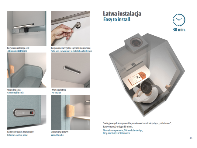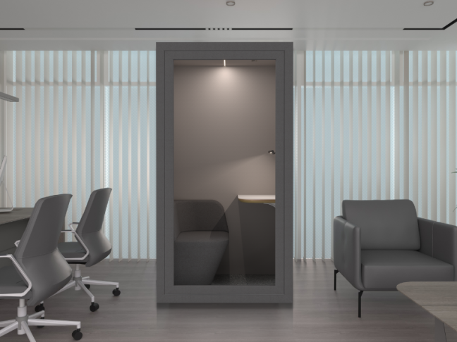 Šiuolaikiška garsui nepralaidi akustinė kabina yra absoliuti būtinybė šiuolaikiniuose atviro erdvės biurų interjeruose, biuruose, oro uostuose, viešbučiuose ir namuose. Kabina suteikia galimybę vesti pokalbius telefonu ar telekonferencijas patogiomis sąlygomis, kuriose galite susikoncentruoti į pokalbį ir jį vesti netrukdydami kolegoms ar namų ūkio nariams. Dėl stiklinių durų salonas atrodo itin lengvas ir papuošia interjerą, kuriame ji yra. Maža, praktiška telefono būdelė puikiai tiks moderniame biure, pasižyminčiame naujovėmis, taip pat namuose kaip patogi vieta dirbti internete, mokytis ar skambinti. Kabina pagaminta iš aukštos kokybės medžiagų, užtikrinančių tinkamą garso izoliaciją. Interjero dizainas ir apdaila skatina naudotis šia patogia erdve, kai tik jos reikia.