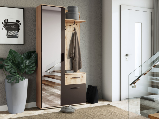 • Medžiaga: laminuota baldų plokštė; kraštas – ABS fanera; spintos nugarėlė – HDF plokštė; rankenos – metalinės; vyriai – metaliniai, veidrodis