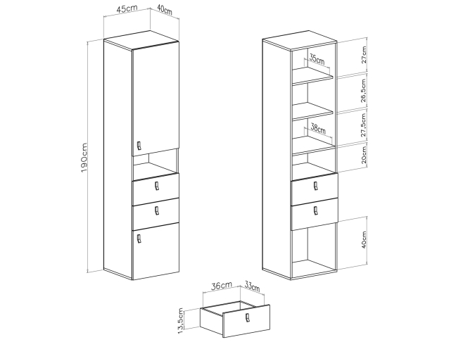 - Bendri išmatavimai (plotis/aukštis/gylis): 45 cm / 190 cm / 40 cm