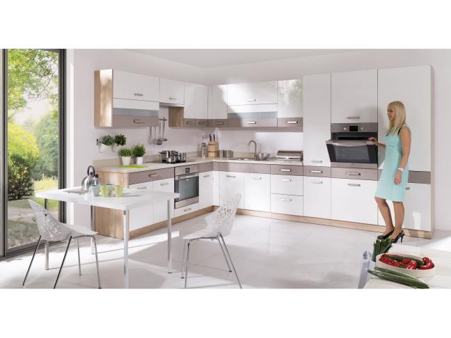 - Metalinės rankenėlės, reguliuojami viršutinių spintelių laikikliai.