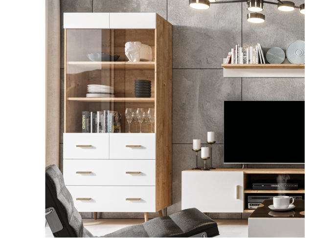 - Vitrininė spinta su trimis stalčiais, dvi lentynos už stiklo. Galimybė įsigyti LED apšvietimą.